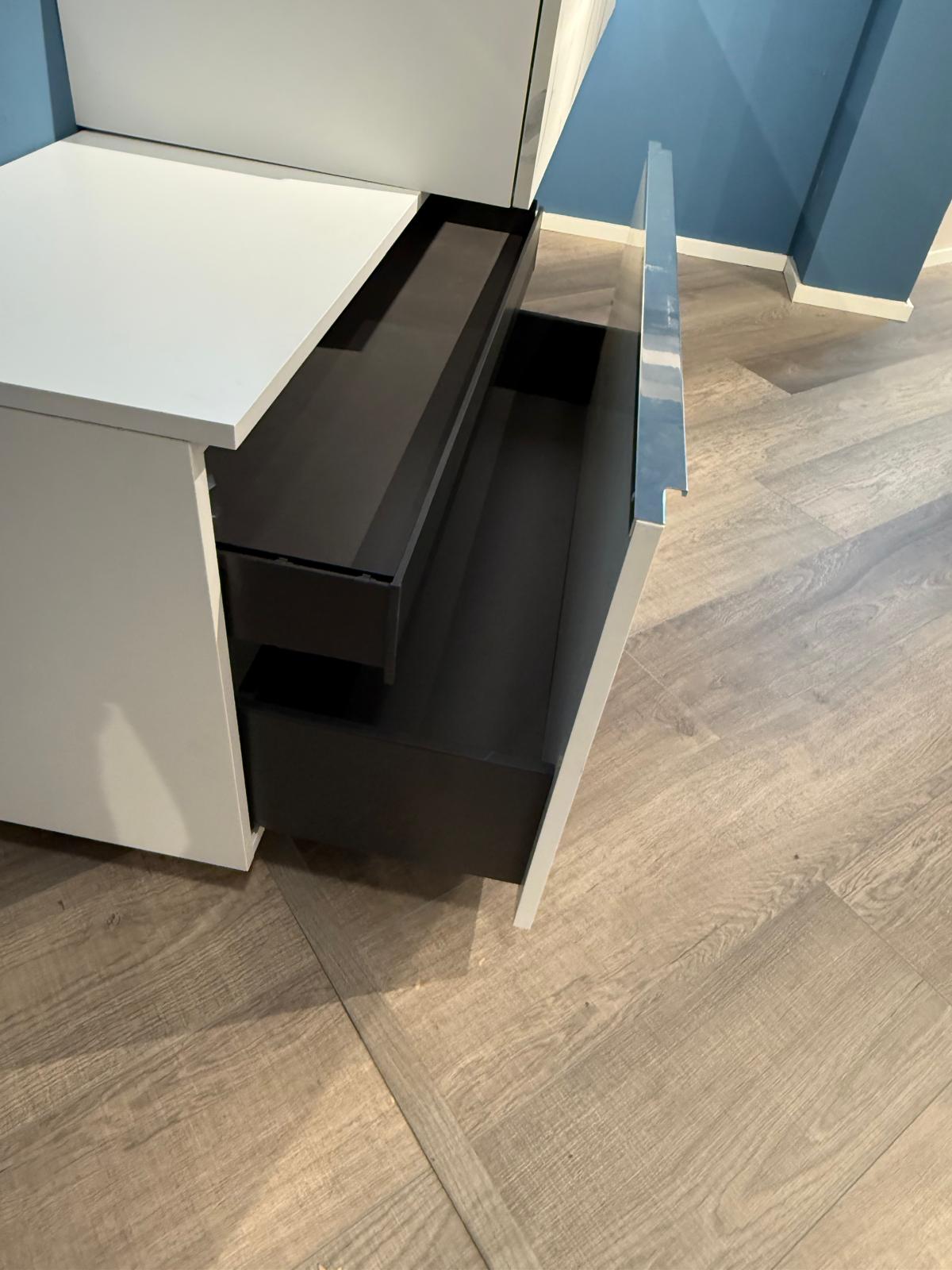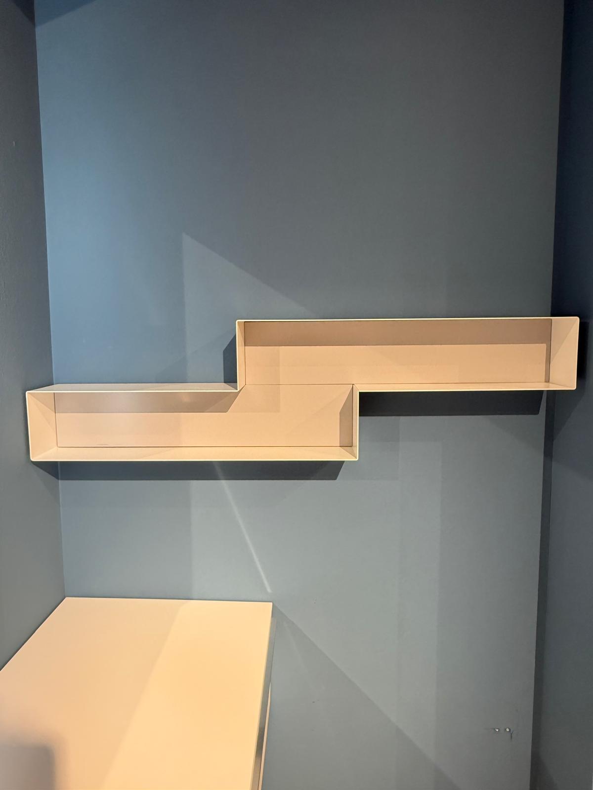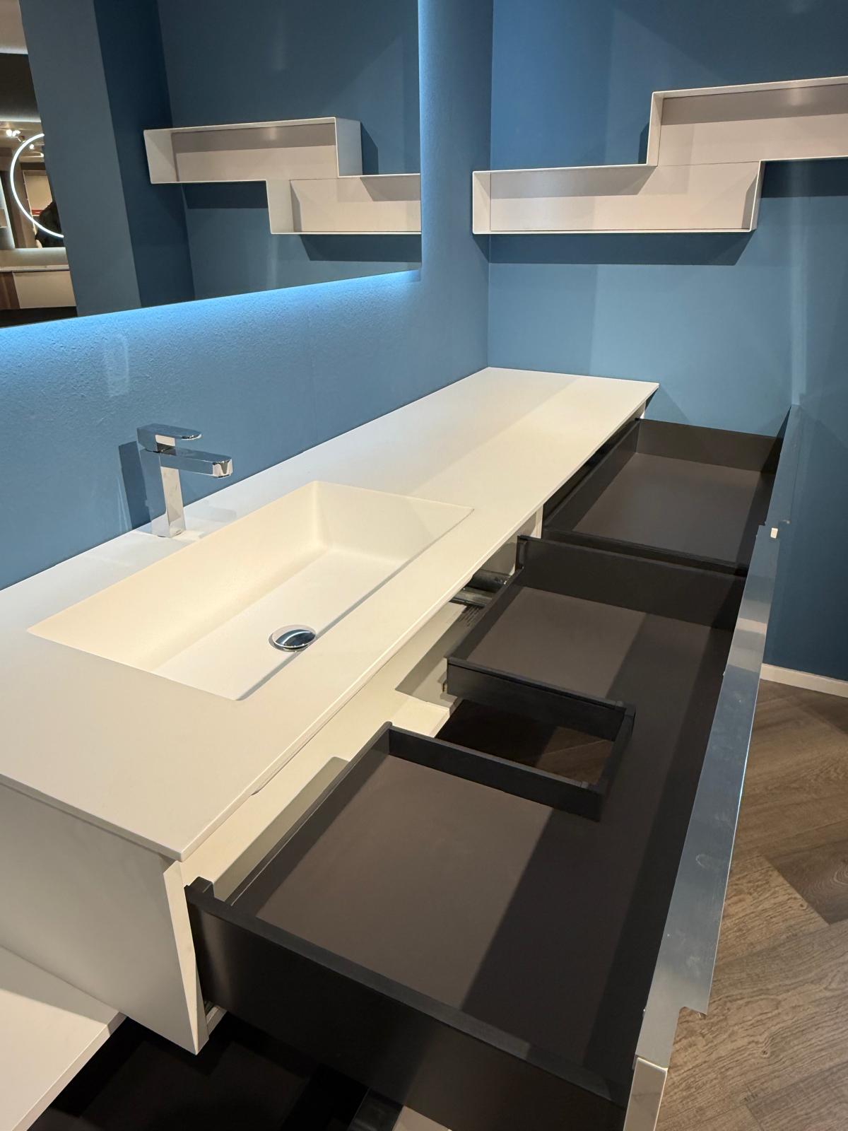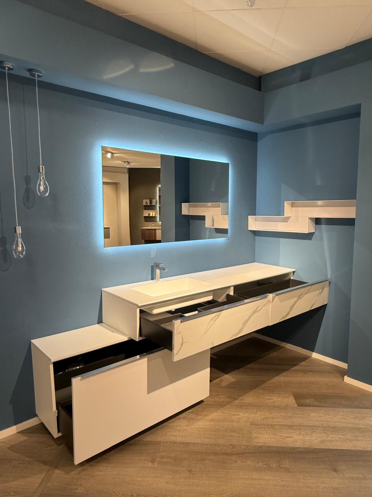 Arcom bagno modello “E.LY” sospeso ad angolo – basi portalavabo L. 190 cm con ante finitura marmo torano – base con cestone L. 105 cm bianco opaco – top e lavabo integrato in teknporil bianco -pensili a giorno in metallo bianco – schiena grigio perla