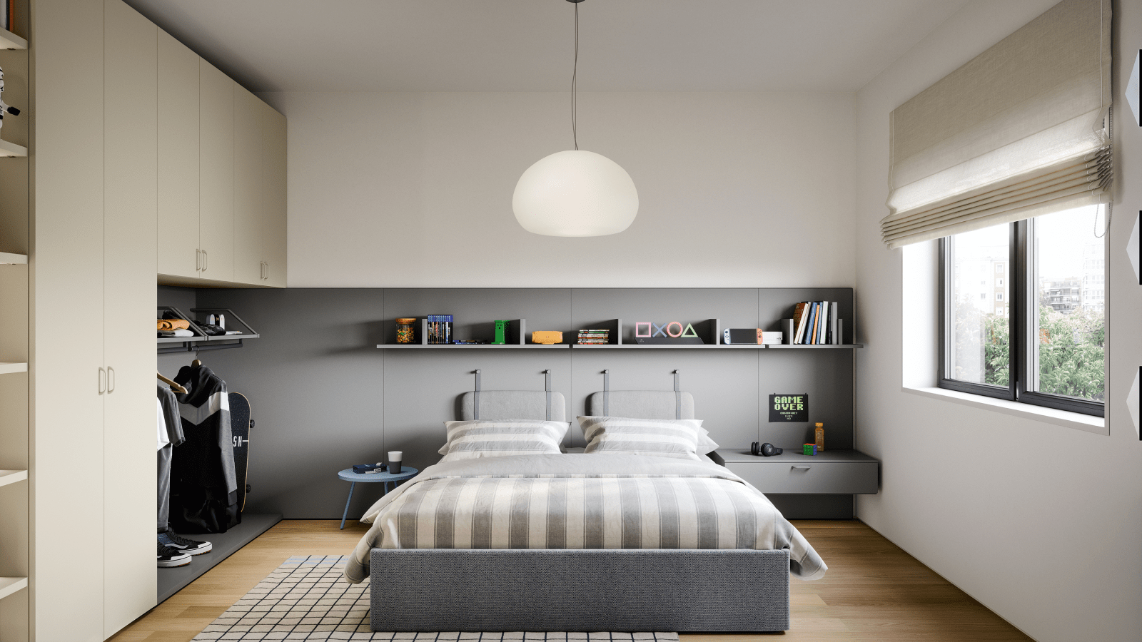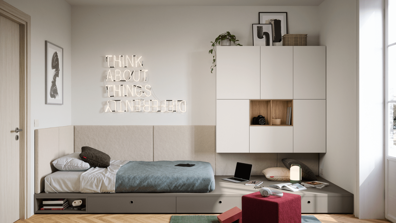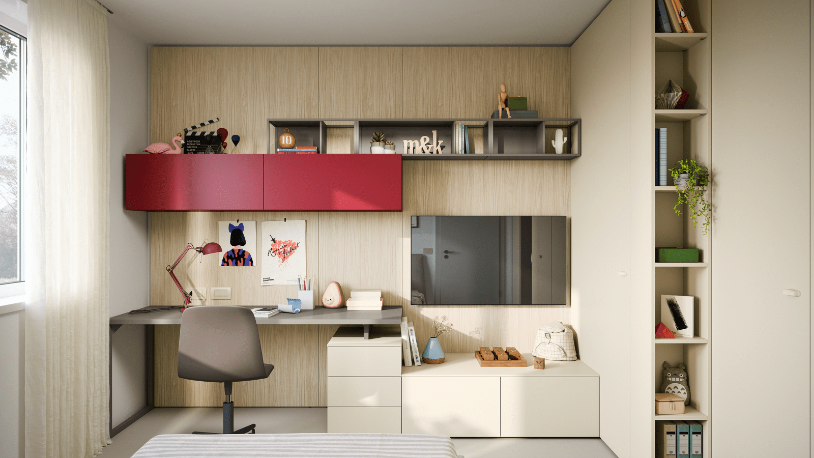 Ogni elemento è pensato per garantire comfort e ordine, senza rinunciare a un tocco di stile. Queste camere sono perfette per chi cerca uno spazio che evolva con il tempo, creando un ambiente dove i ragazzi possano sentirsi liberi di esprimersi, studiare, socializzare e crescere.
