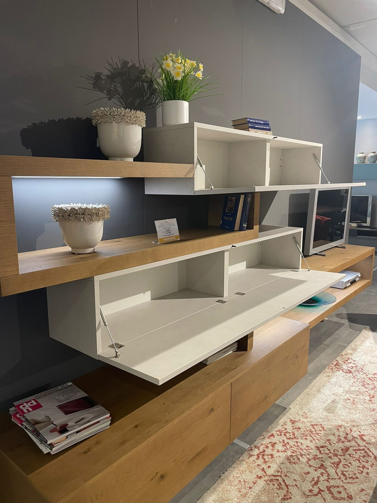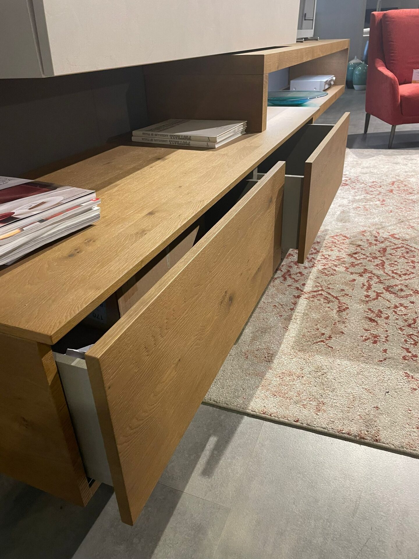 Composizione giorno con mensole a forte spessore e base a cestoni estraibili in legno rovere nodato;