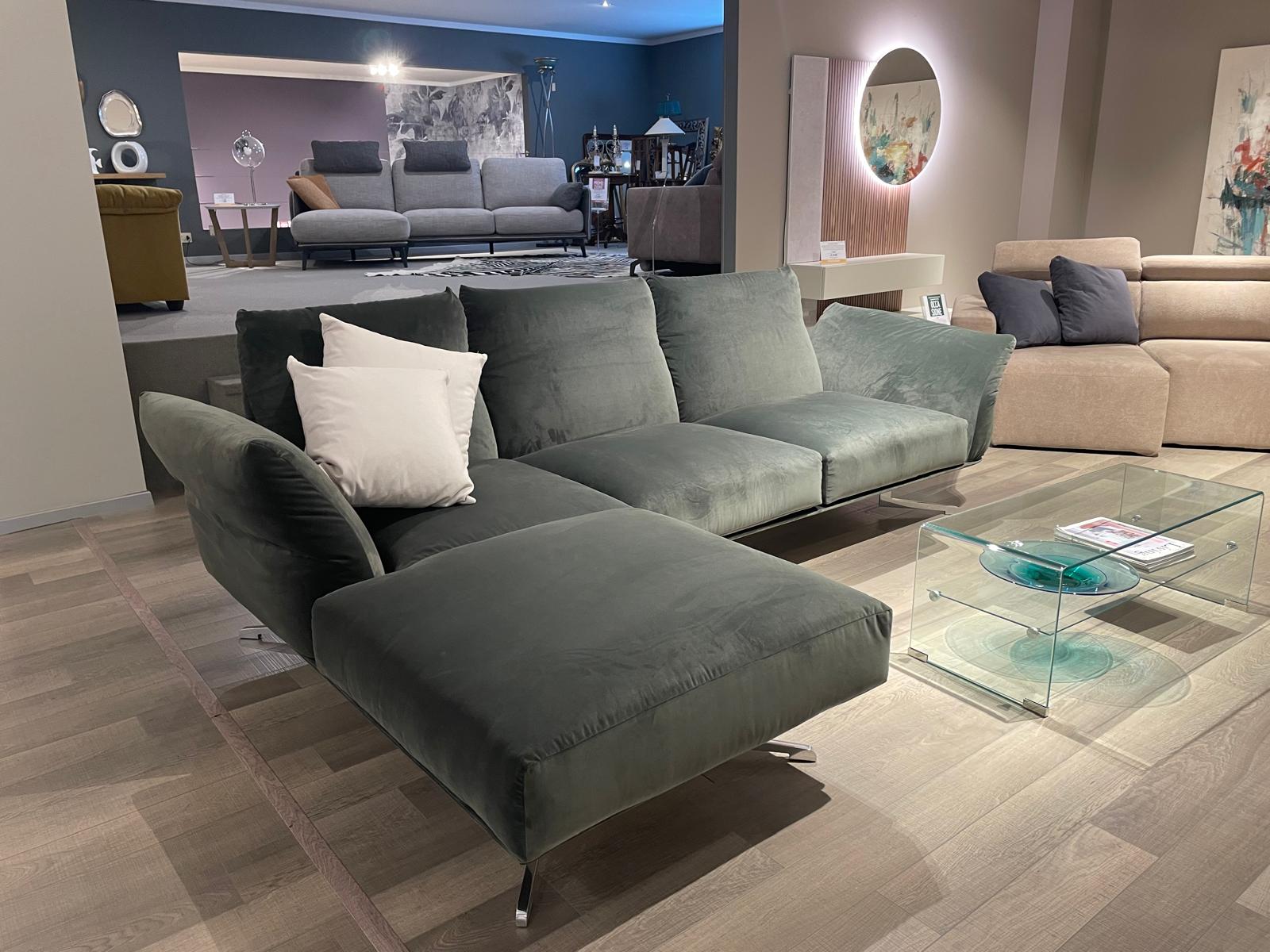 Composizione divano con dormeause in tessuto di pregio (velluto verde antimacchia) in versione sfoderabile e piedi in alluminio lucido. Cuscini di seduta in piuma d’oca con inserto in poliuretano espanso ecologico. Il divano è dotato di uno speciale meccanismo flessibile su braccioli e schienale per un alto comfort.