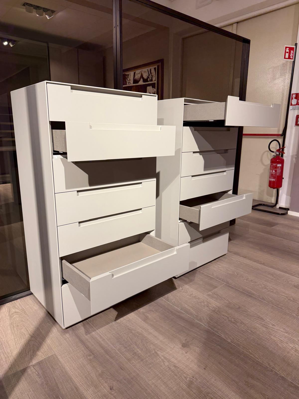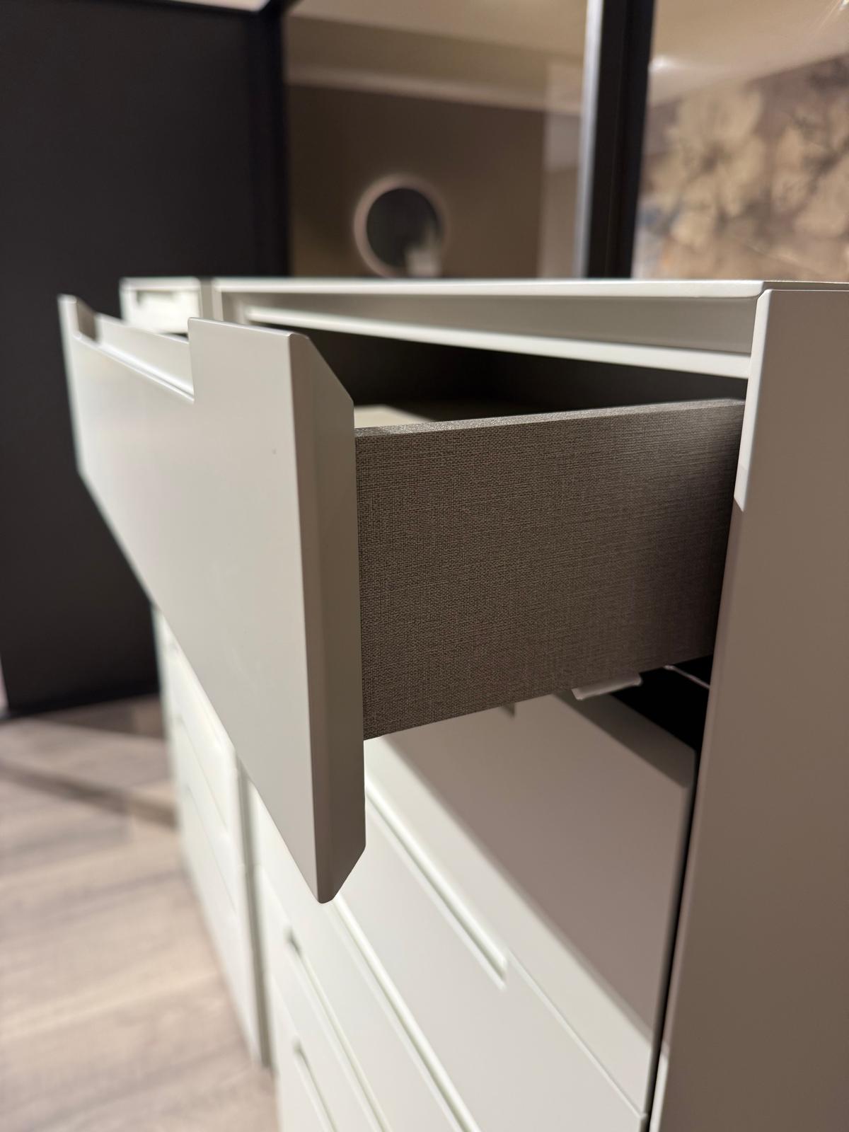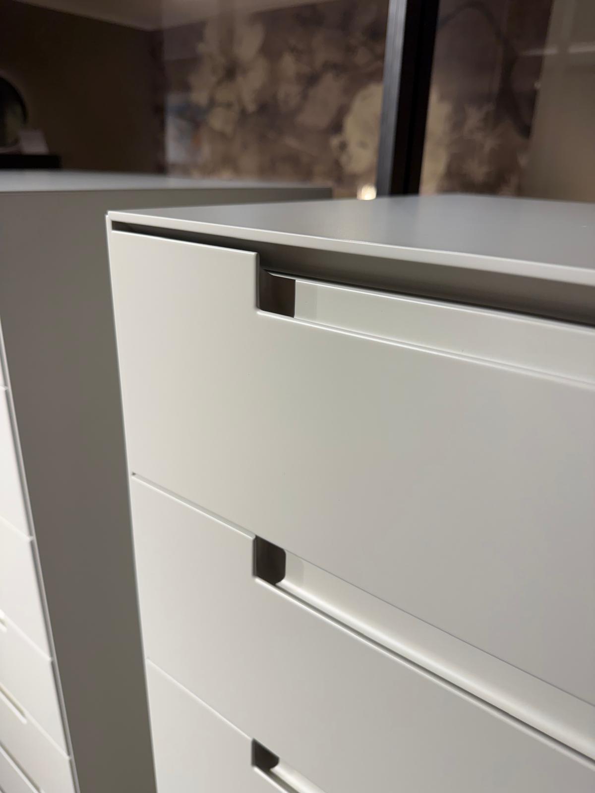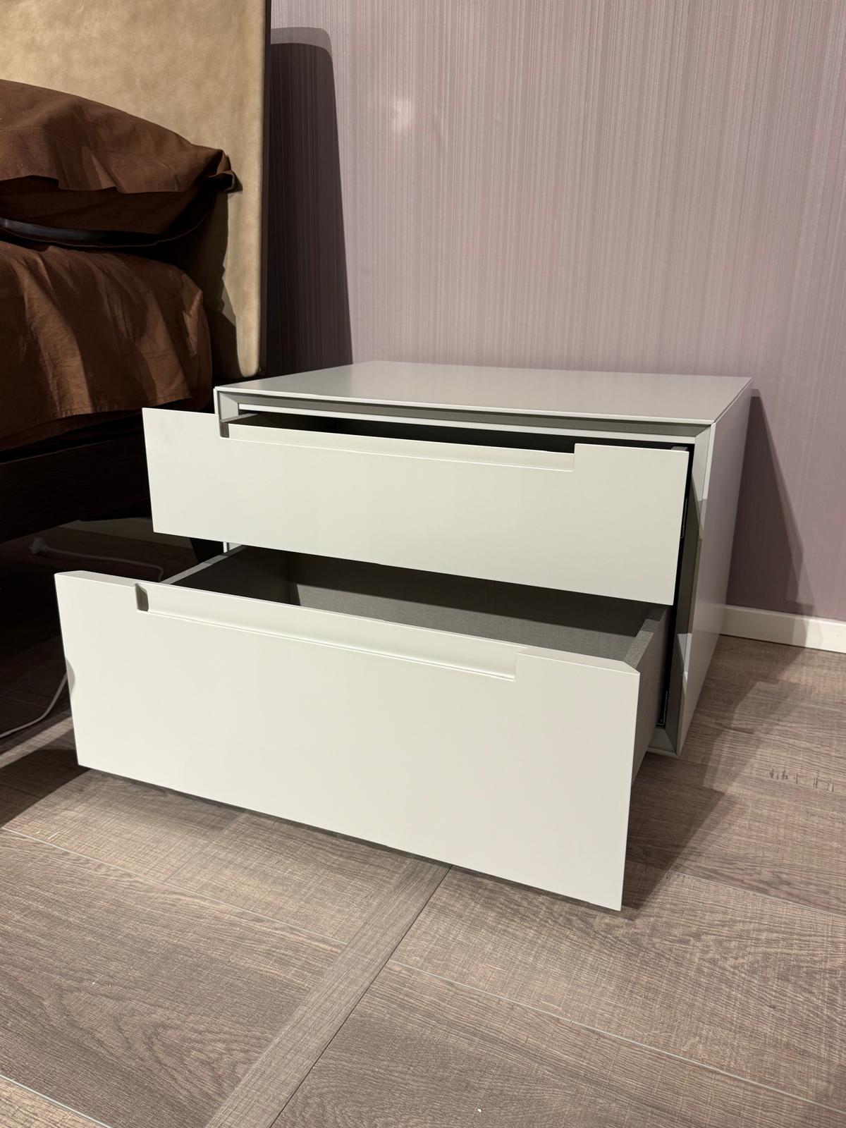 Raffinato gruppo notte, realizzato con taglio a 45 gradi, completamente laccato opaco con maniglia ricavata sull’anta.