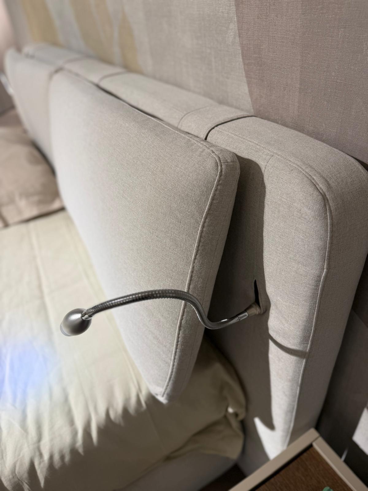 Letti sfoderabile rivestito in tessuto. Completo di box contenitore e luci laterali con accensione touch.
