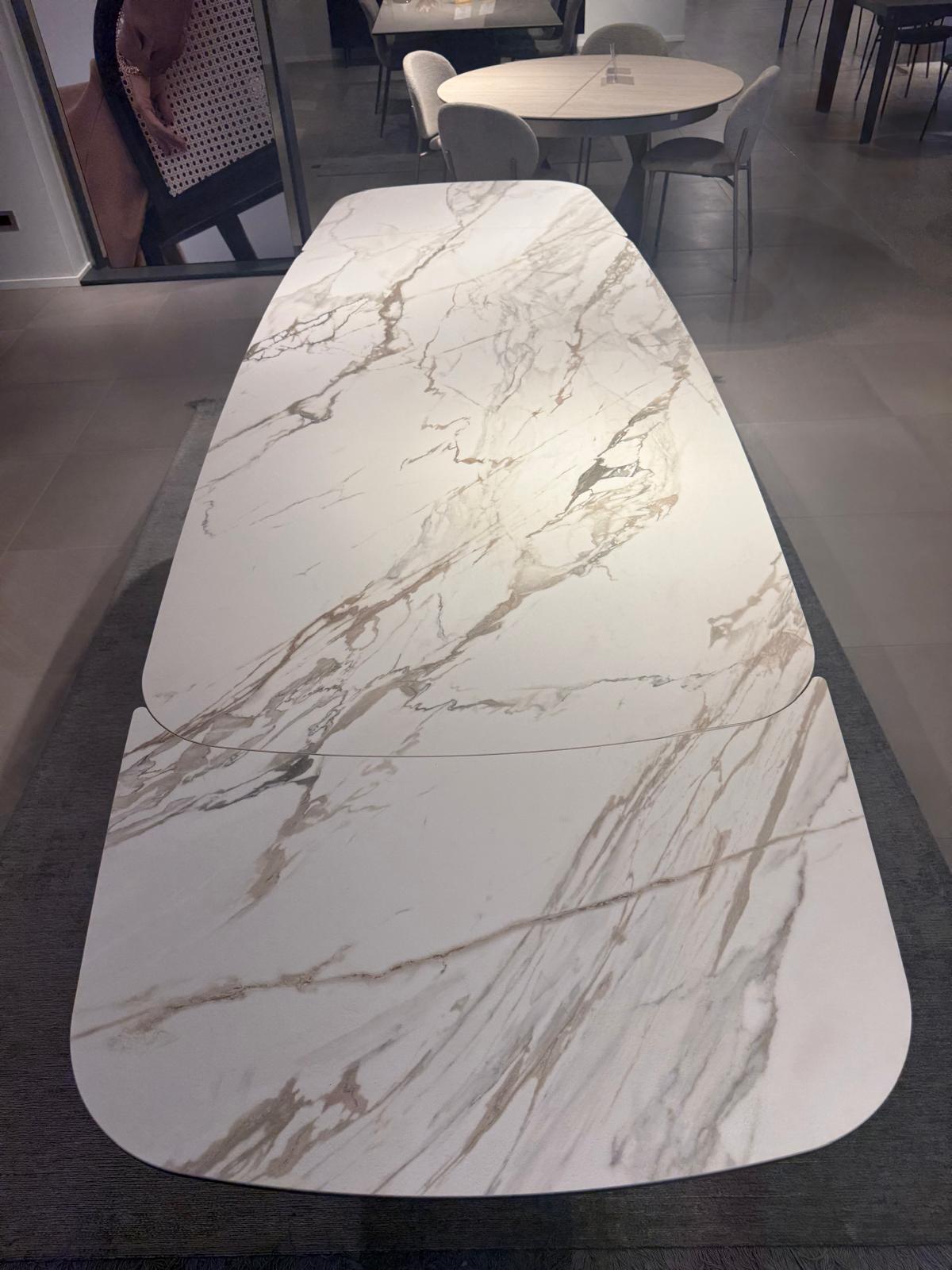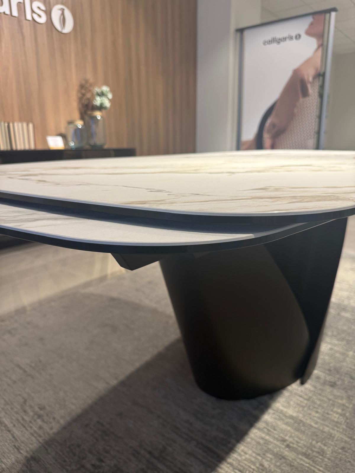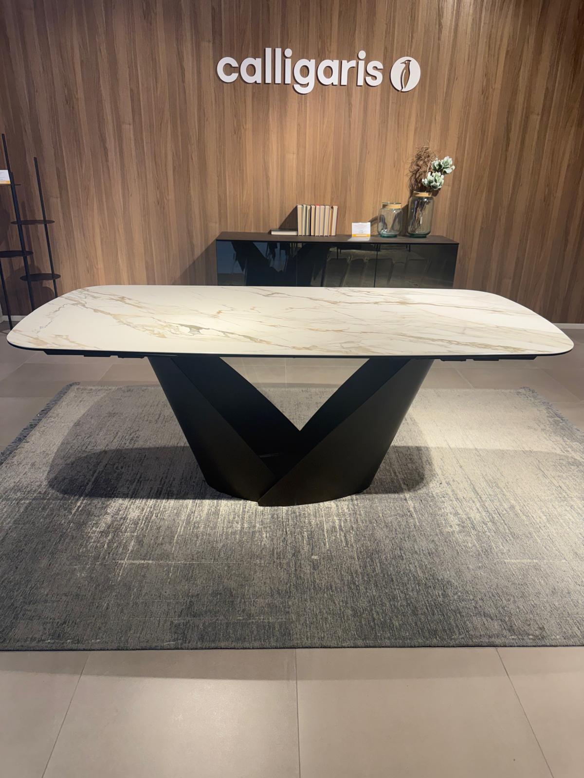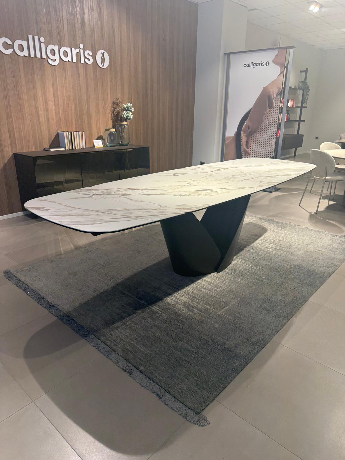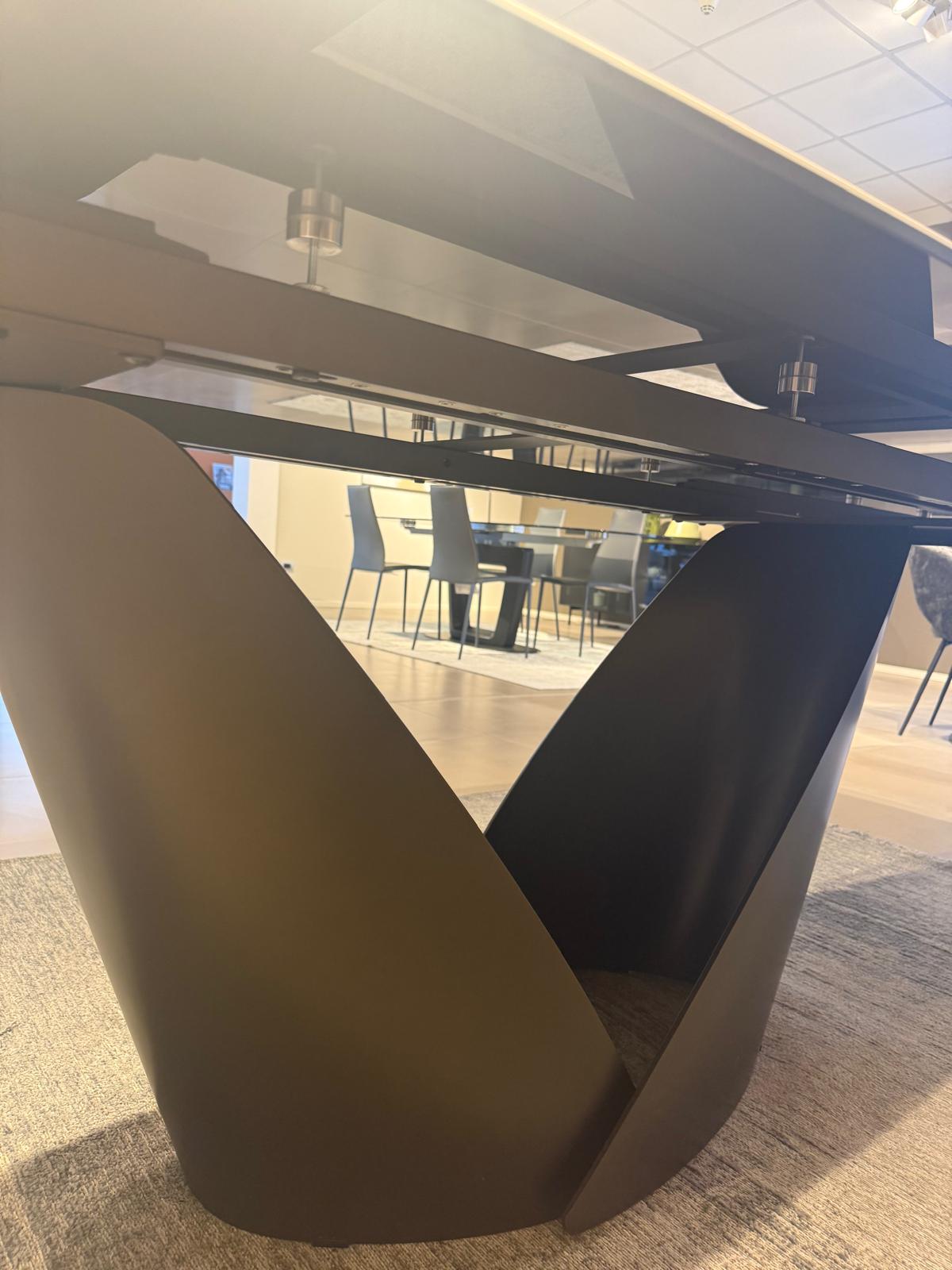 Tavolo modello Calla allungabile, in gres opaco con base bronzo.